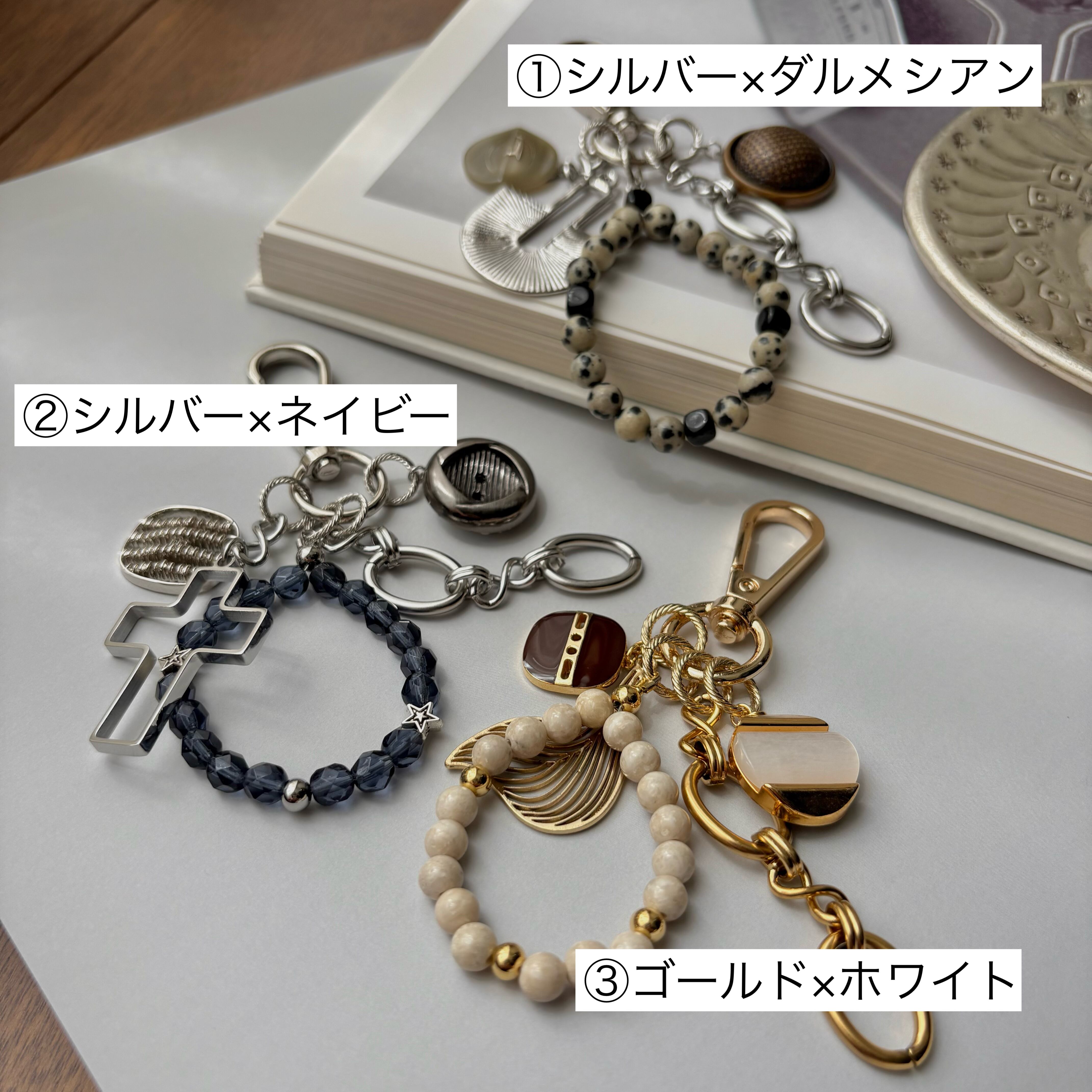 ヴィンテージボタンやメタルチャームを組み合わせた、大人のためのバッグチャーム。