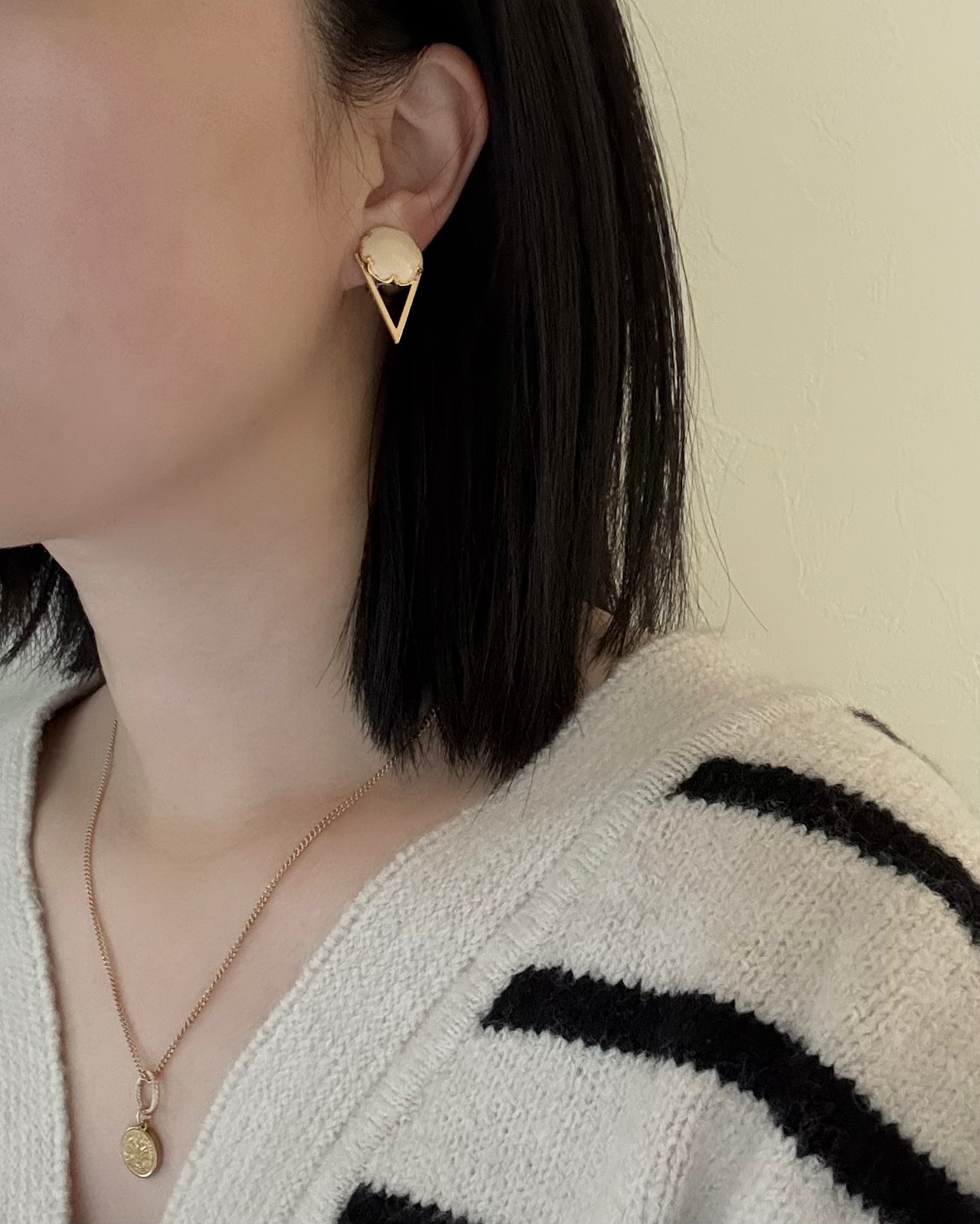エナメル製のヴィンテージボタンは、温かみのあるアイボリーカラーと繊細なメタルの縁取りが耳元に上品な存在感をプラス。