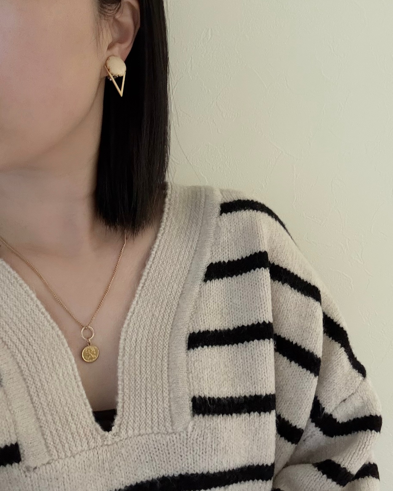 ボタンのクラシカルな美しさを引き立てる、シャープなV字型のゴールドパーツを組み合わせ、ヴィンテージ感とトレンド感を両立させました。