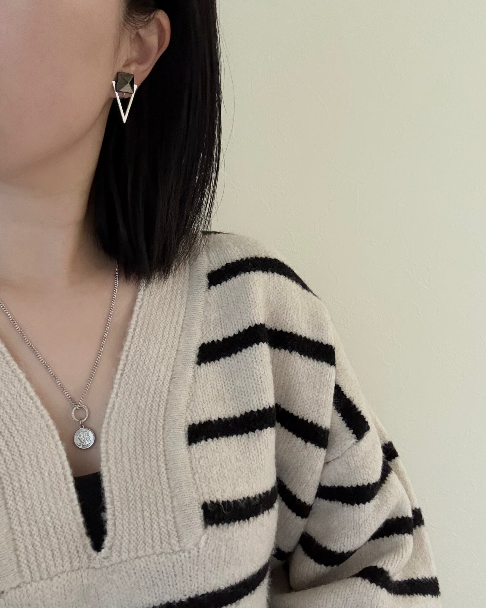 V字型のシルバーパーツとの組み合わせが、都会的なエッジとモダンな雰囲気を演出します。