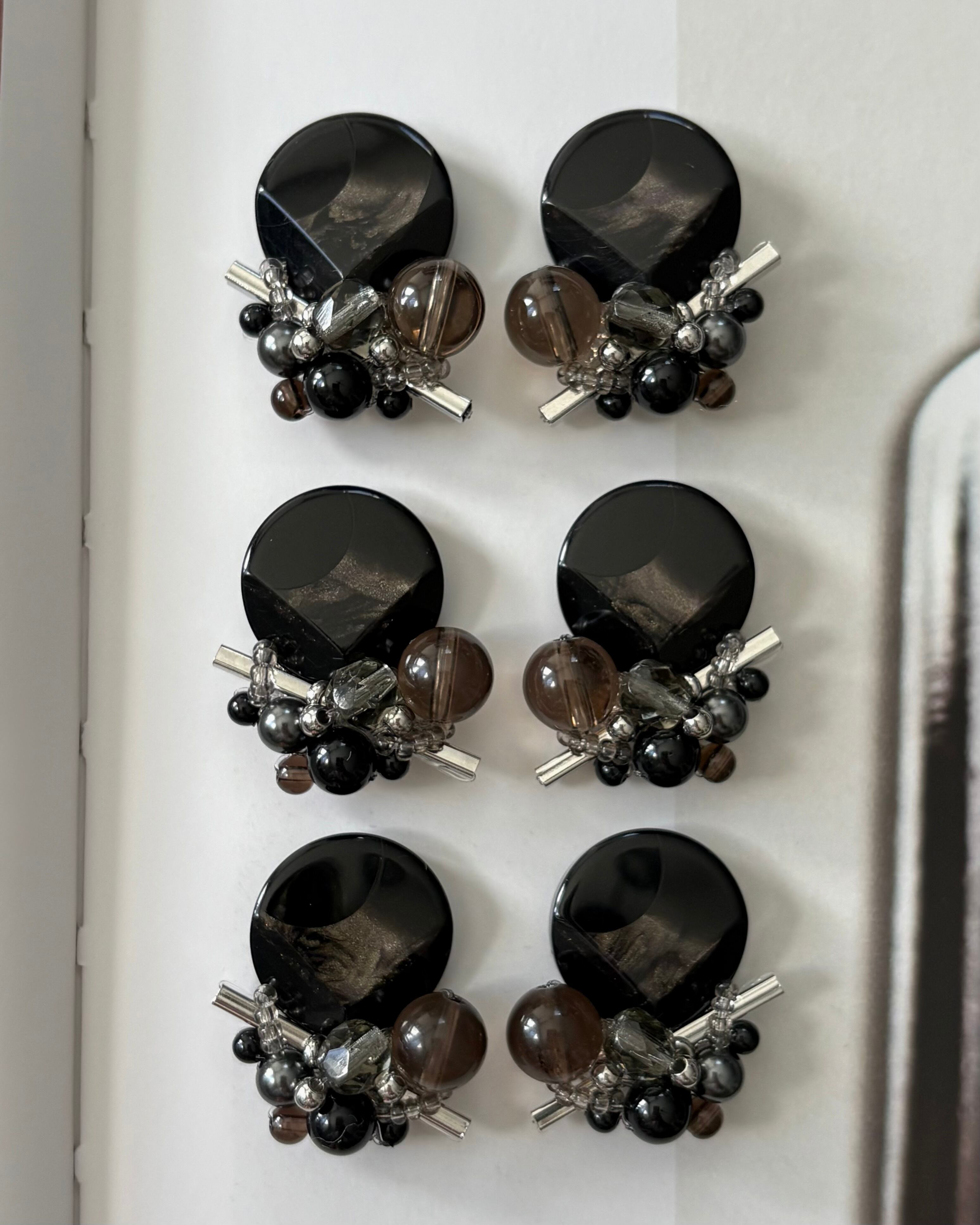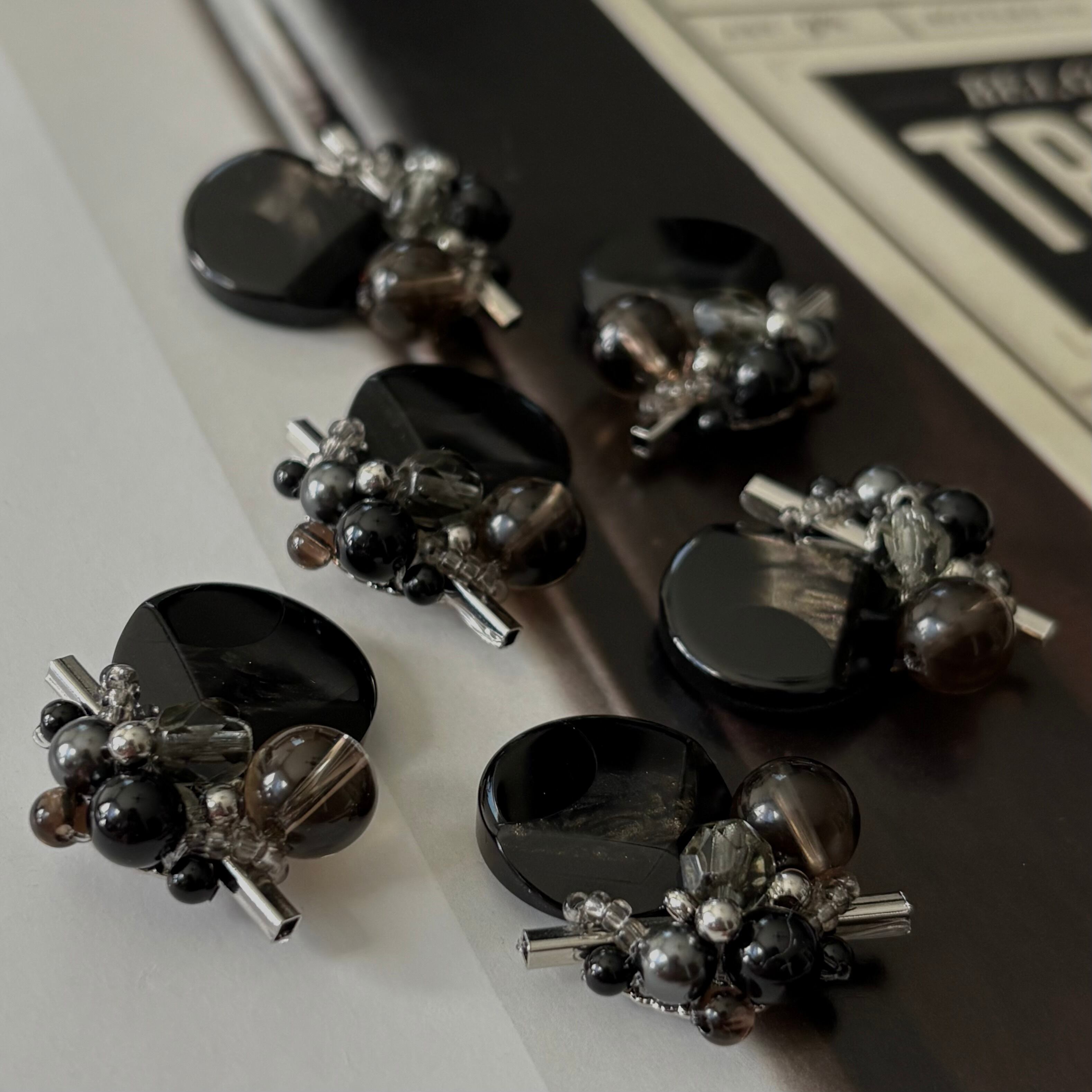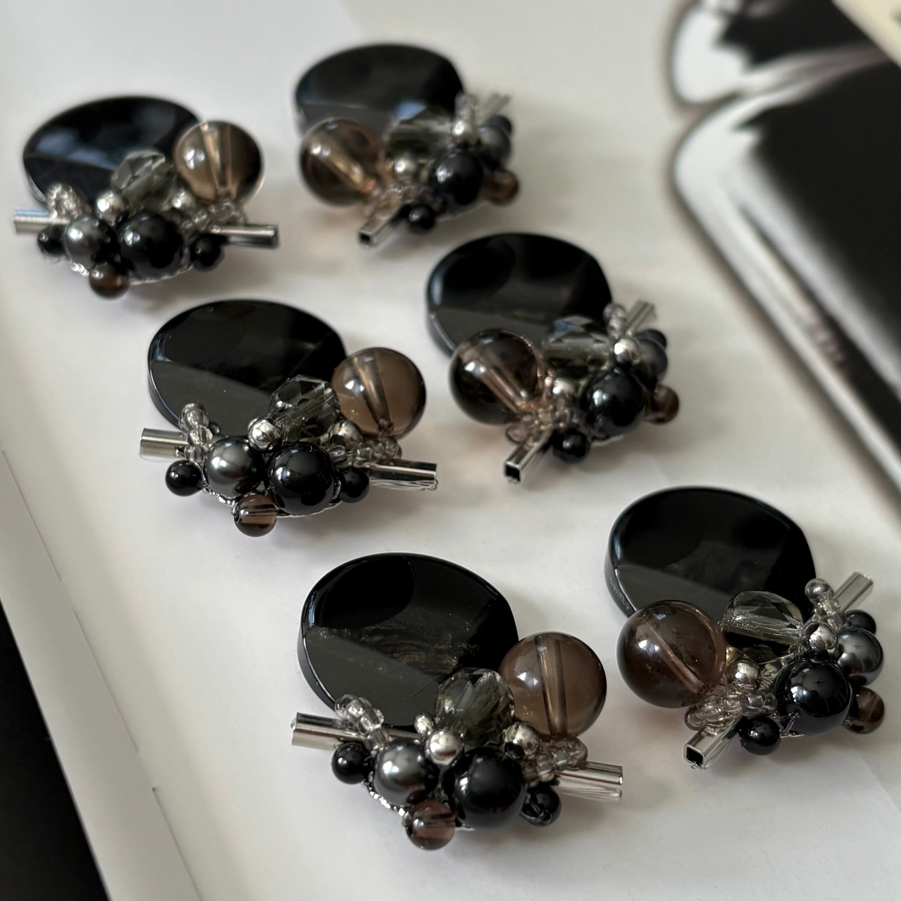 ヴィンテージボタン、メタルパーツ、貴和クリスタルパール、アクリルビーズ、スモーキークォーツ