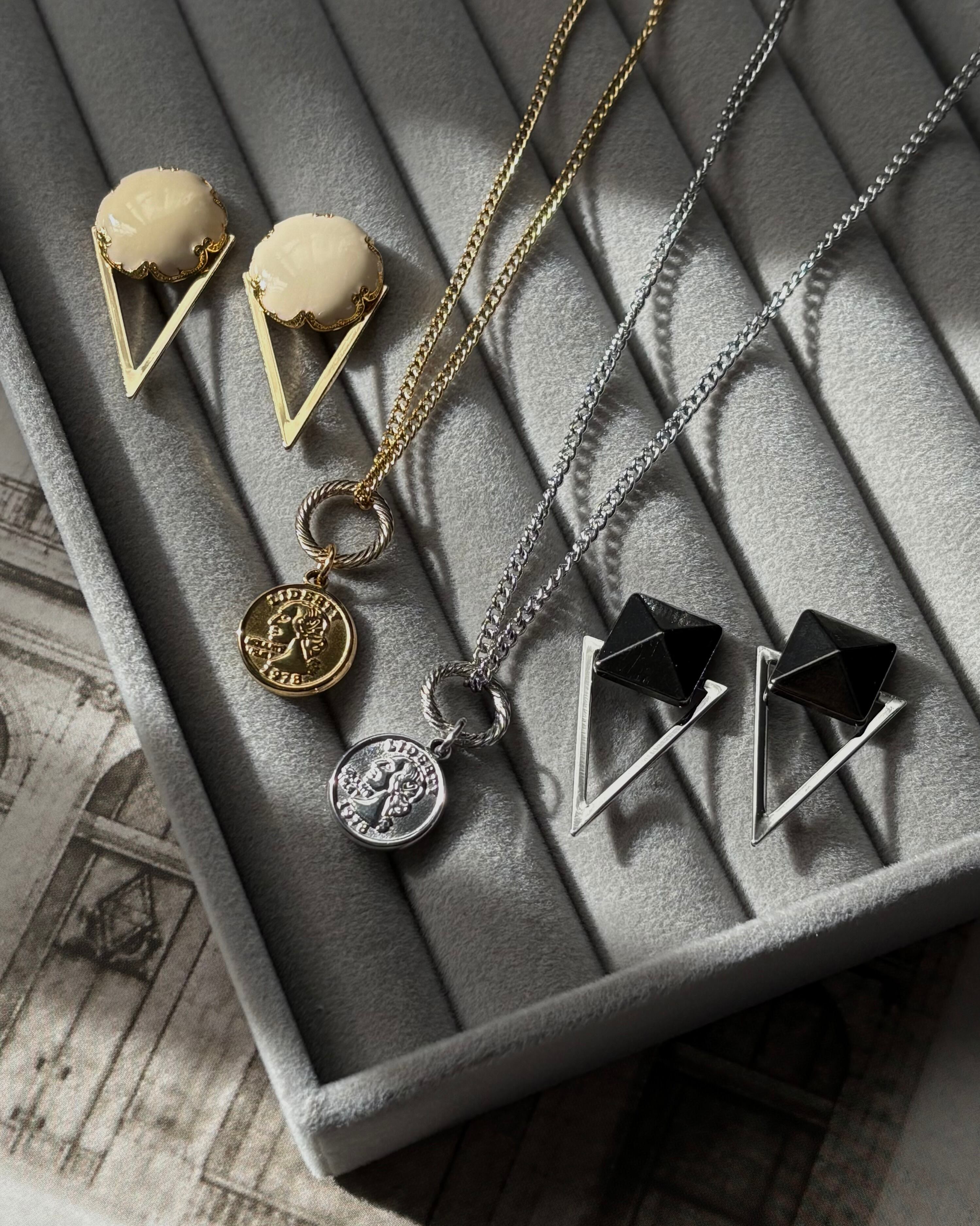 ボタンのクラシカルな美しさを引き立てる、シャープなV字型のゴールドパーツを組み合わせ、ヴィンテージ感とトレンド感を両立させました。