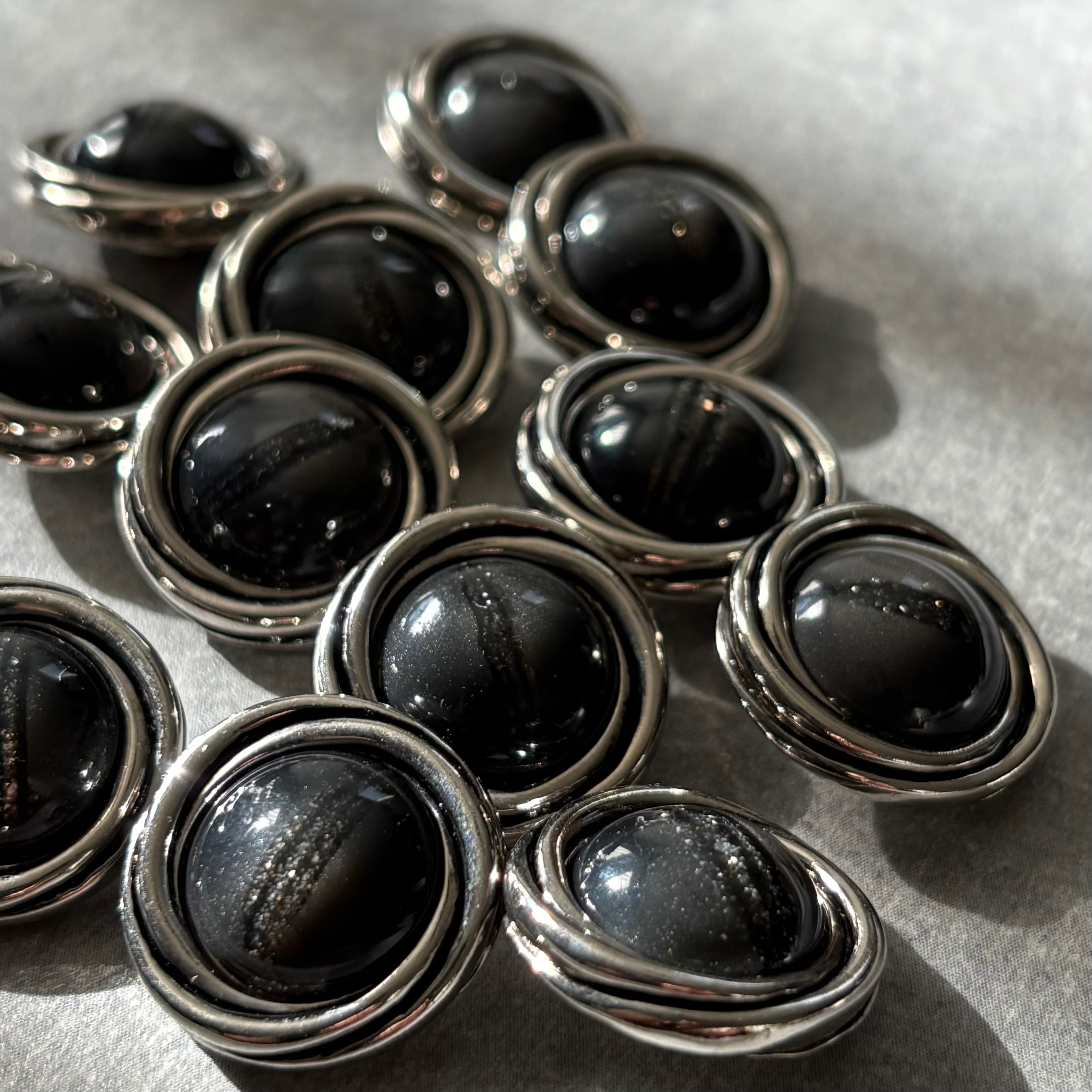 ツヤ感のあるグレーのベースの中央に細かなラメのラインが輝く、日本製のヴィンテージボタンを使用しました。