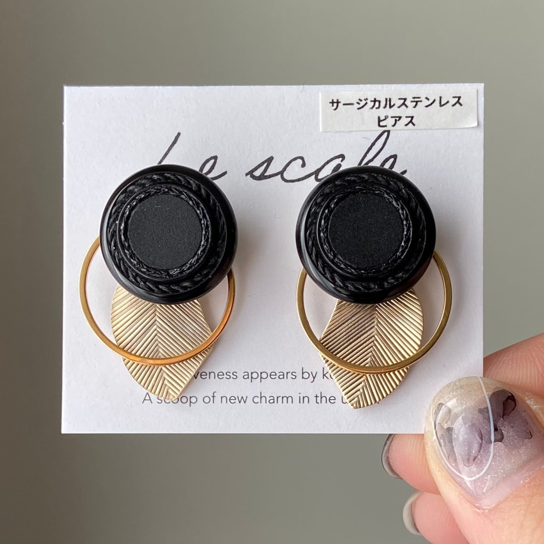 ブラックのボタンにゴールドの羽模様チャームが添えられた、洗練された一点もの。
