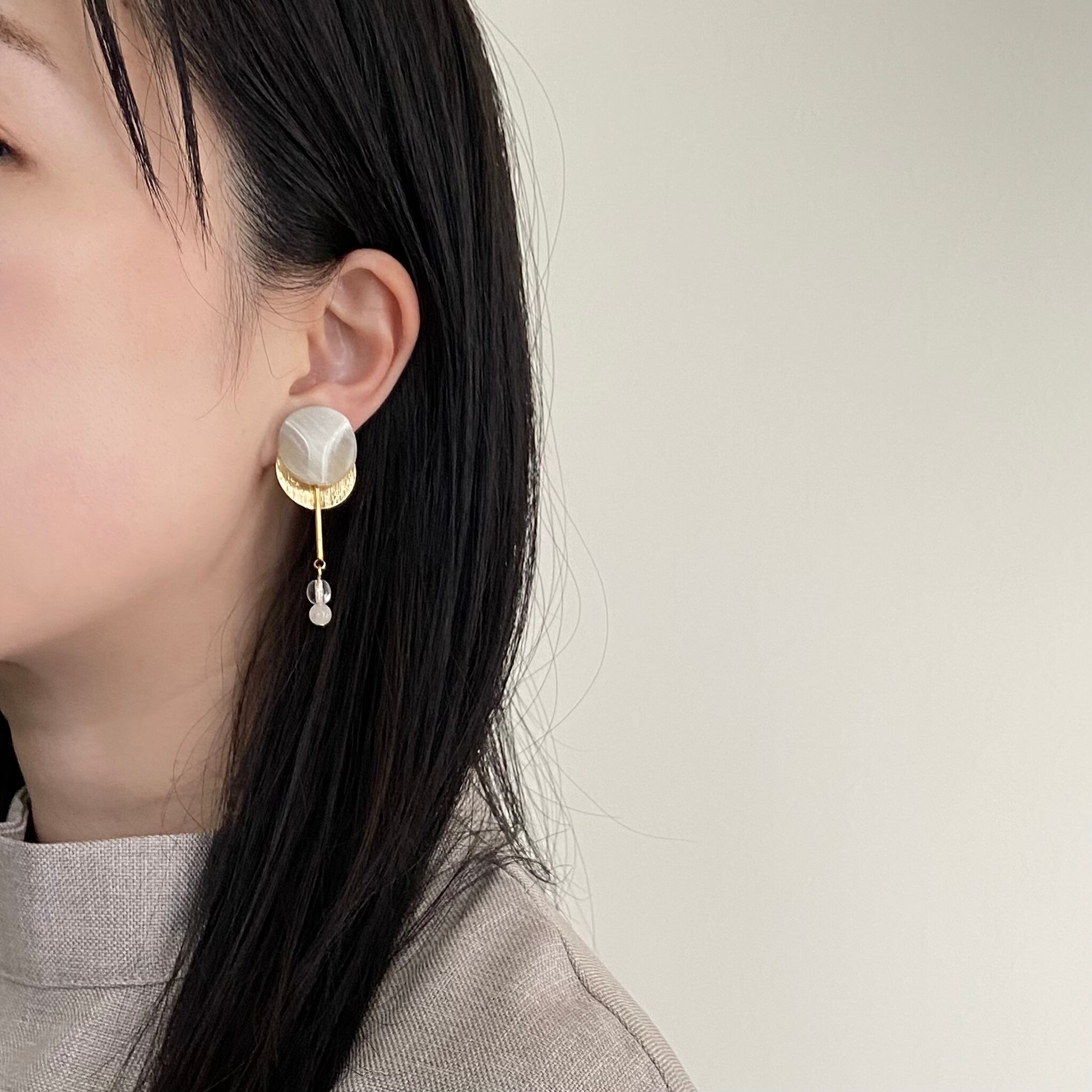 優しいニュアンスグレーのヴィンテージボタンにゴールドパーツを合わせ、軽やかで柔らか、それでいて品格が漂うピアス/イヤリングに仕上がりました。